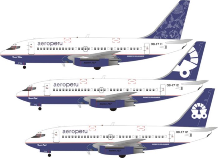 Aeroperú 737-200´s used three different schemes, two experimental as shown in the first two drawings below before they were repainted to their final scheme as shown by the third aircraft until the company ceaced operations