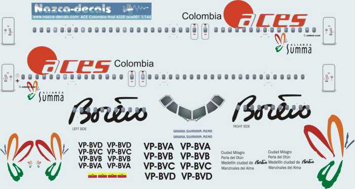 The Aces Airbus A320 set last scheme with ”allianza Summa” logos includes the necessary decals to build one of the four aircraft operated by this company, also included the “ciudad de Botero” markings