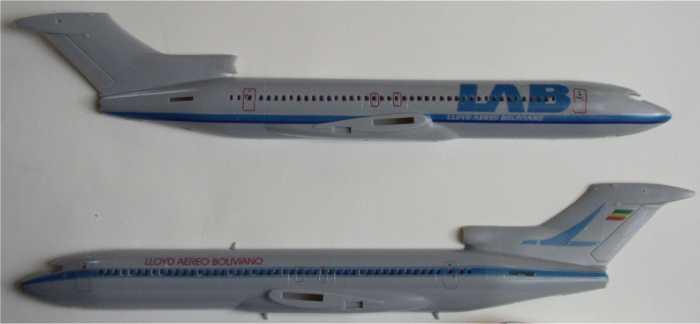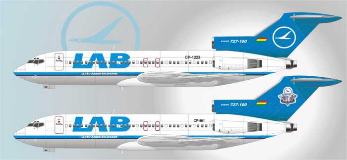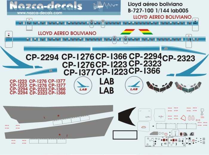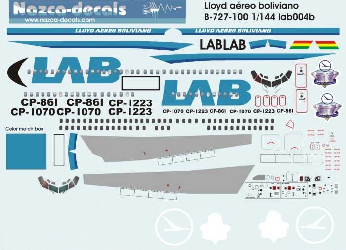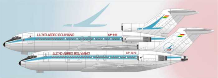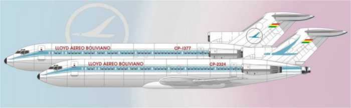 The workhorse of the bolivian national airline, the 727 has been operated during decades out of one of the highest airports of the world (el alto, la Paz) with excellents results, LAB uses both versions the shorter 100 version in combi freight passenger mixed configutarion and the streched 200 for medium range and high density routes. We offer four decal sets to built your favorite 727 in the older or final “Vasp” scheme with full data of aircraft detail and registrations.
