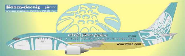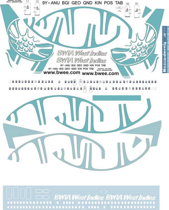 The BWIA- west indies airways, national carrier of Trinidad and Tobago has lately introduced an amazing steel pan scheme in its entire fleet, the big decal set offers the outline designs an detail and need to be completed with a paint work for the main fuselage parts, the color must be matched with the decal to obtain an accurate finish, white undergrounds are also provided for windows, doors and detail, also a second part set for the lower fuselage offers spares for broken parts and a third set provides guideline for paint work masking.
